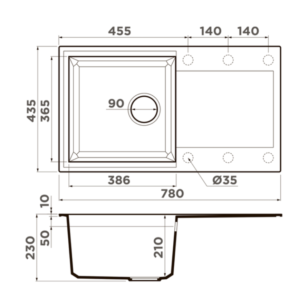 Мойка кухонная Omoikiri из коллекции Sakaime 78-PL имеет размеры 780х435 мм., изготовлена из искусственного гранита. Форма — прямоугольная, одна чаша без отверстия для смесителя. Сифон в комплекте. Ширина чаши 38,6. Врезной монтаж. Имеется крыло.