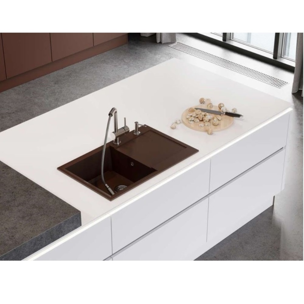 Мойка кухонная Omoikiri из коллекции Sakaime 79-GR имеет размеры 790х500 мм., изготовлена из искусственного гранита. Форма — прямоугольная, одна чаша без отверстия для смесителя. Сифон в комплекте. Ширина чаши 39. Врезной монтаж. Имеется крыло.