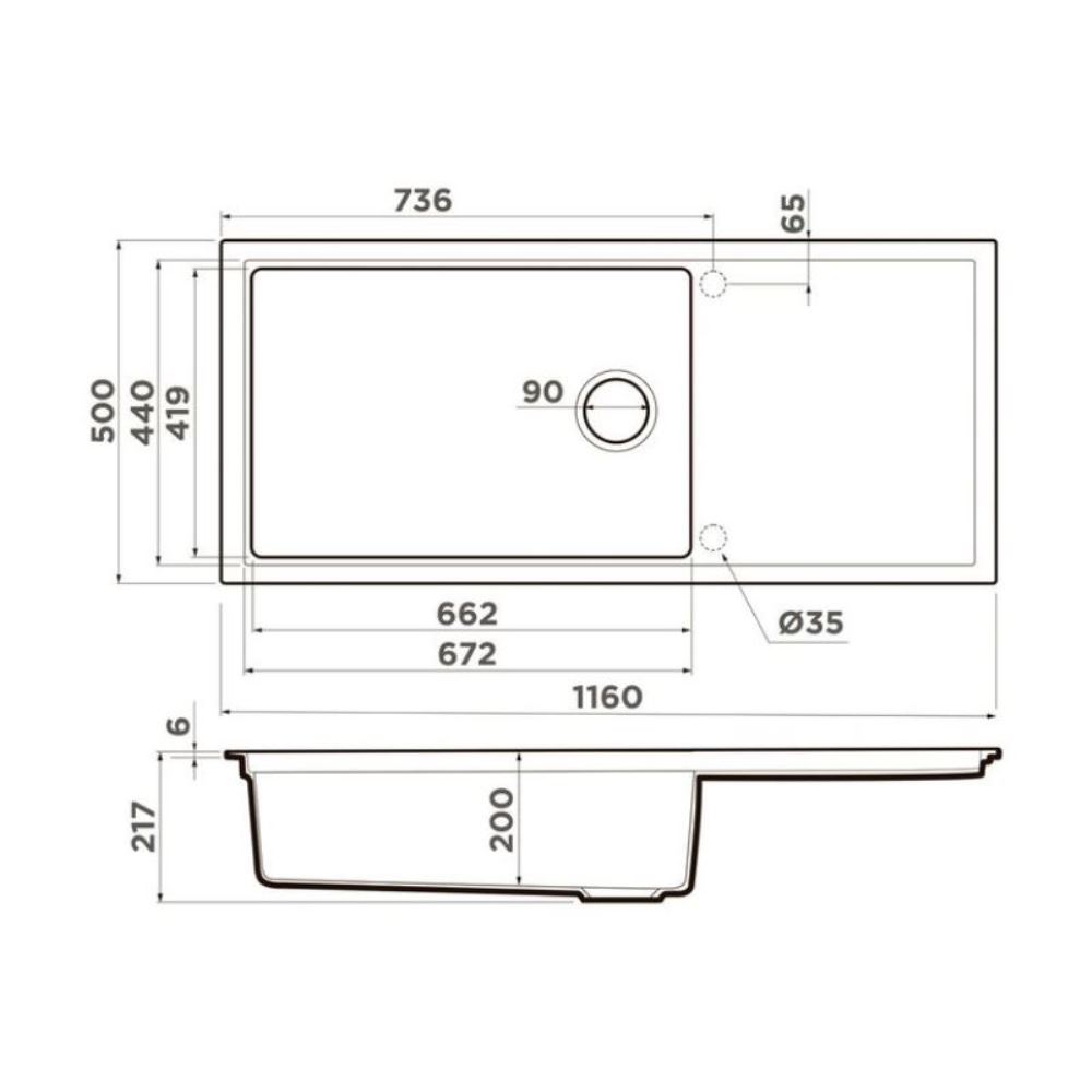 Мойка кухонная Omoikiri из коллекции Sintesi 116-CN имеет размеры 1160х500 мм., изготовлена из искусственной керамики. Форма — прямоугольная, одна чаша без отверстия для смесителя. Сифон в комплекте. Ширина чаши 66,2. Врезной монтаж. Имеется крыло.