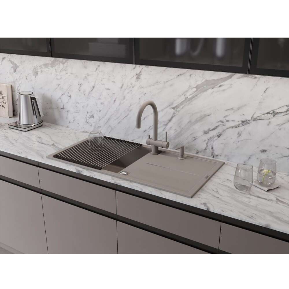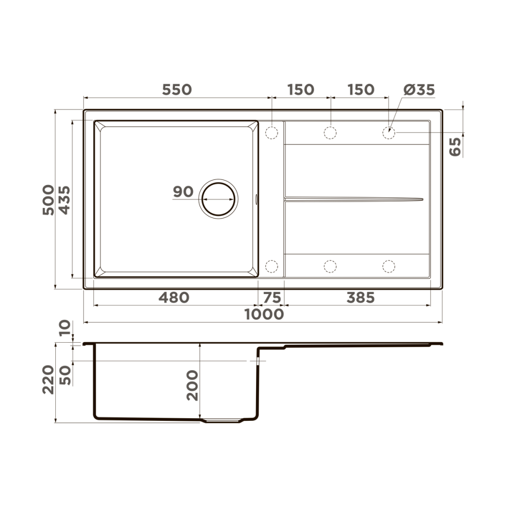 Мойка кухонная Omoikiri из коллекции Sumi 100A-GB имеет размеры 1000х500 мм., изготовлена из искусственного гранита. Форма — прямоугольная, одна чаша без отверстия для смесителя. Сифон в комплекте. Ширина чаши 48. Врезной монтаж.