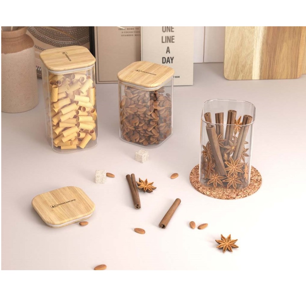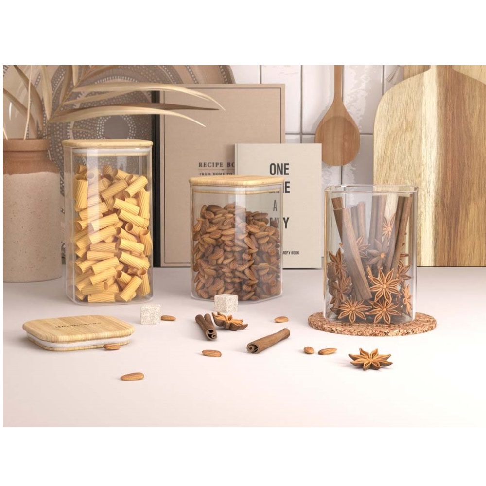 Корпус — стекло, крышка — бамбук. В комплекте 3 банки (1 — 1400 мл, 2 — по 1000 мл).