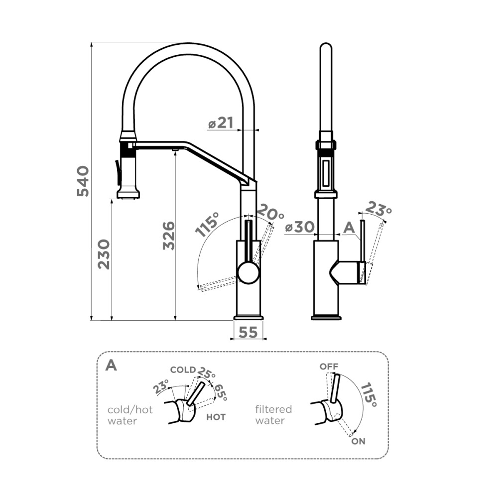 Смеситель для кухни Omoikiri Makkari 2 Plus с подключением фильтра оснащен рычажным управлением для регулировки температуры и напора воды. Горизонтальный монтаж на 1 отверстие. Гибкий излив 235 мм.