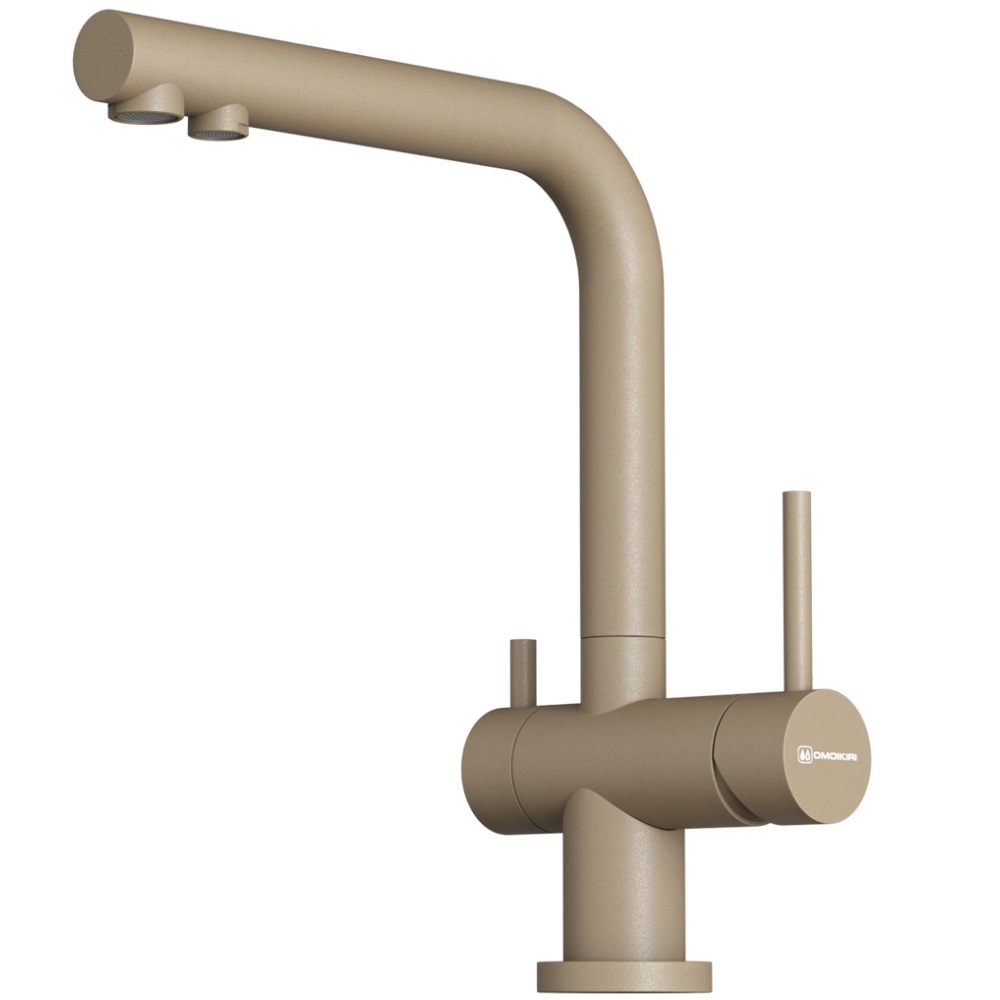 Смеситель для кухни Omoikiri Nagano с подключением фильтра оснащен рычажным управлением для регулировки температуры и напора воды. Горизонтальный монтаж на 1 отверстие. Поворотный излив 176 мм.